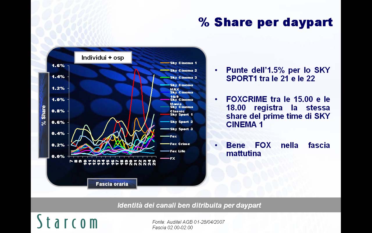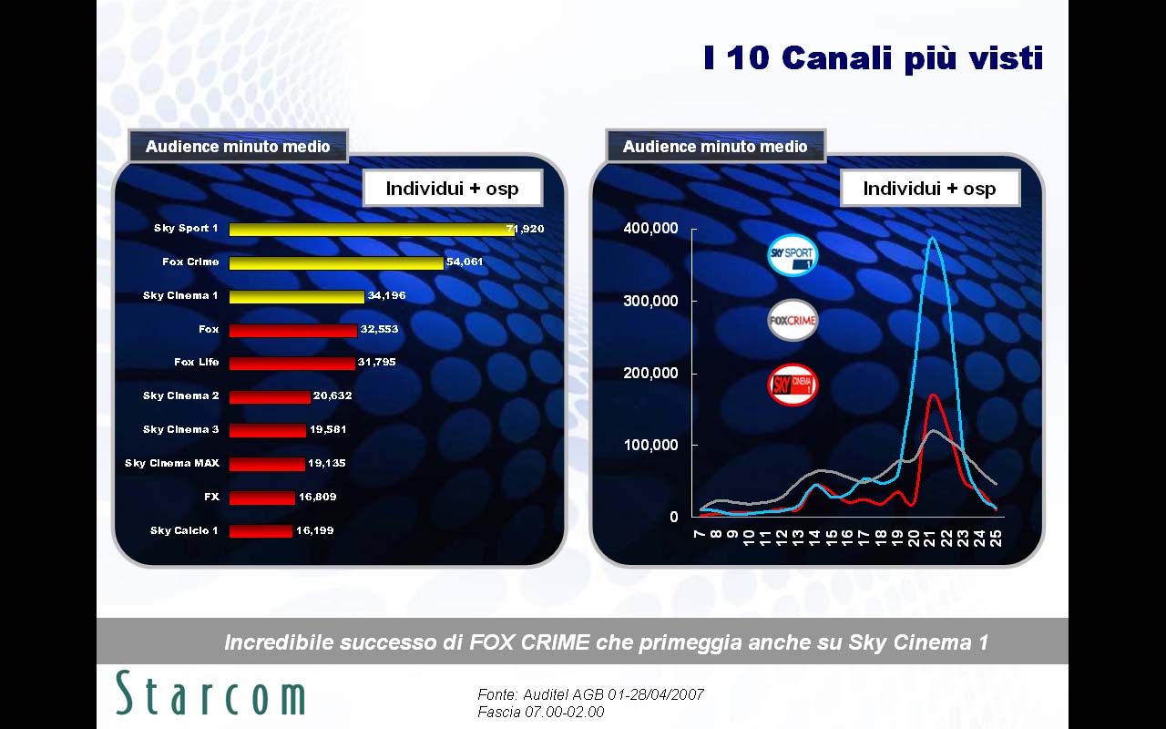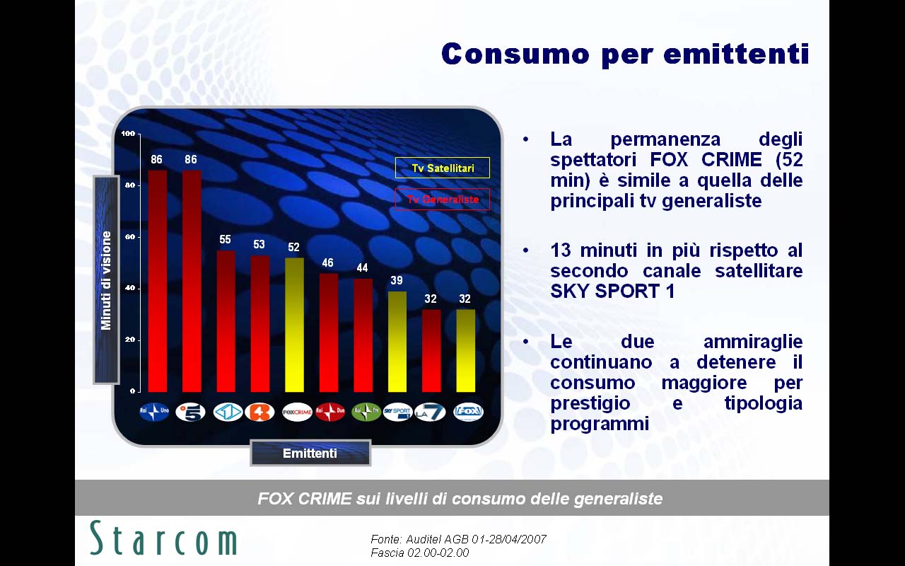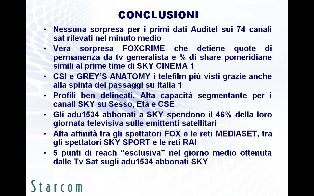 Le principali evidenze emerse nella ricerca (disponibile in allegato) riguardano innanzitutto le brillanti performance in contatti e permanenza di Fox Crime, spinto da due telefilm di successo quali Csi e Grey's Anatomy, l'alta capacità segmentante per i canali Sky su sesso, età e ceto sociale, e i numerosi abbonati a Sky che spendono il 46% della loro giornata televisiva sulle emittenti satellitari.
