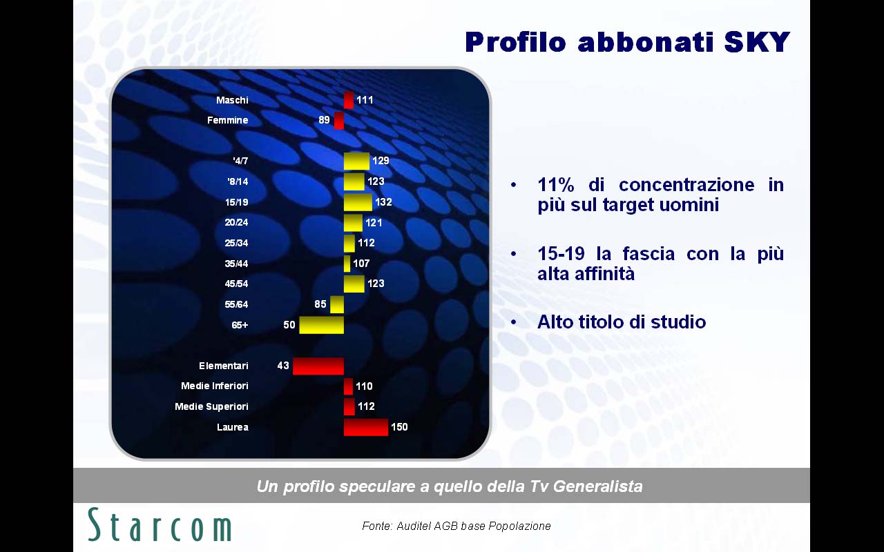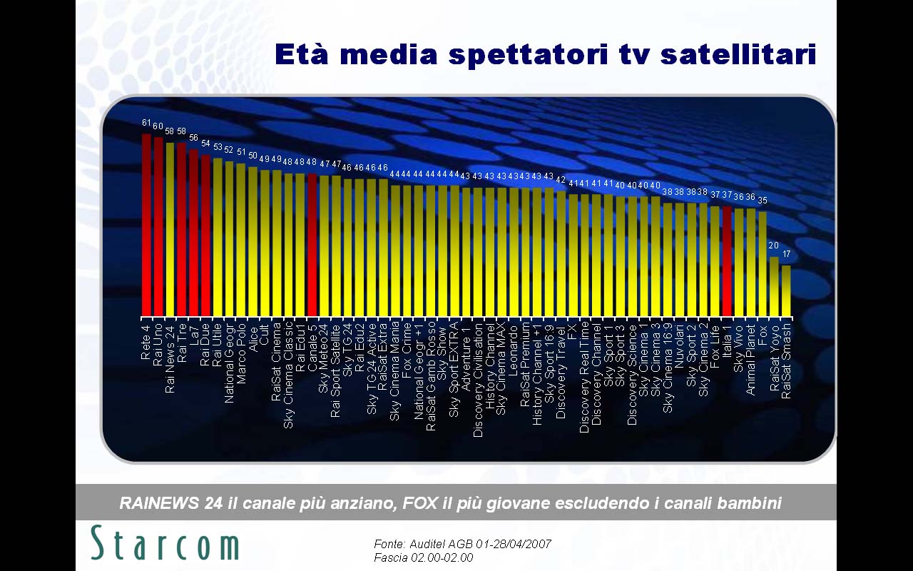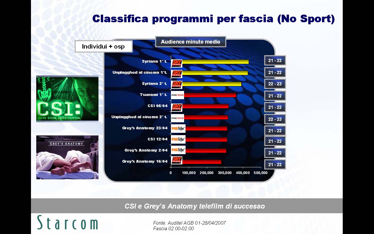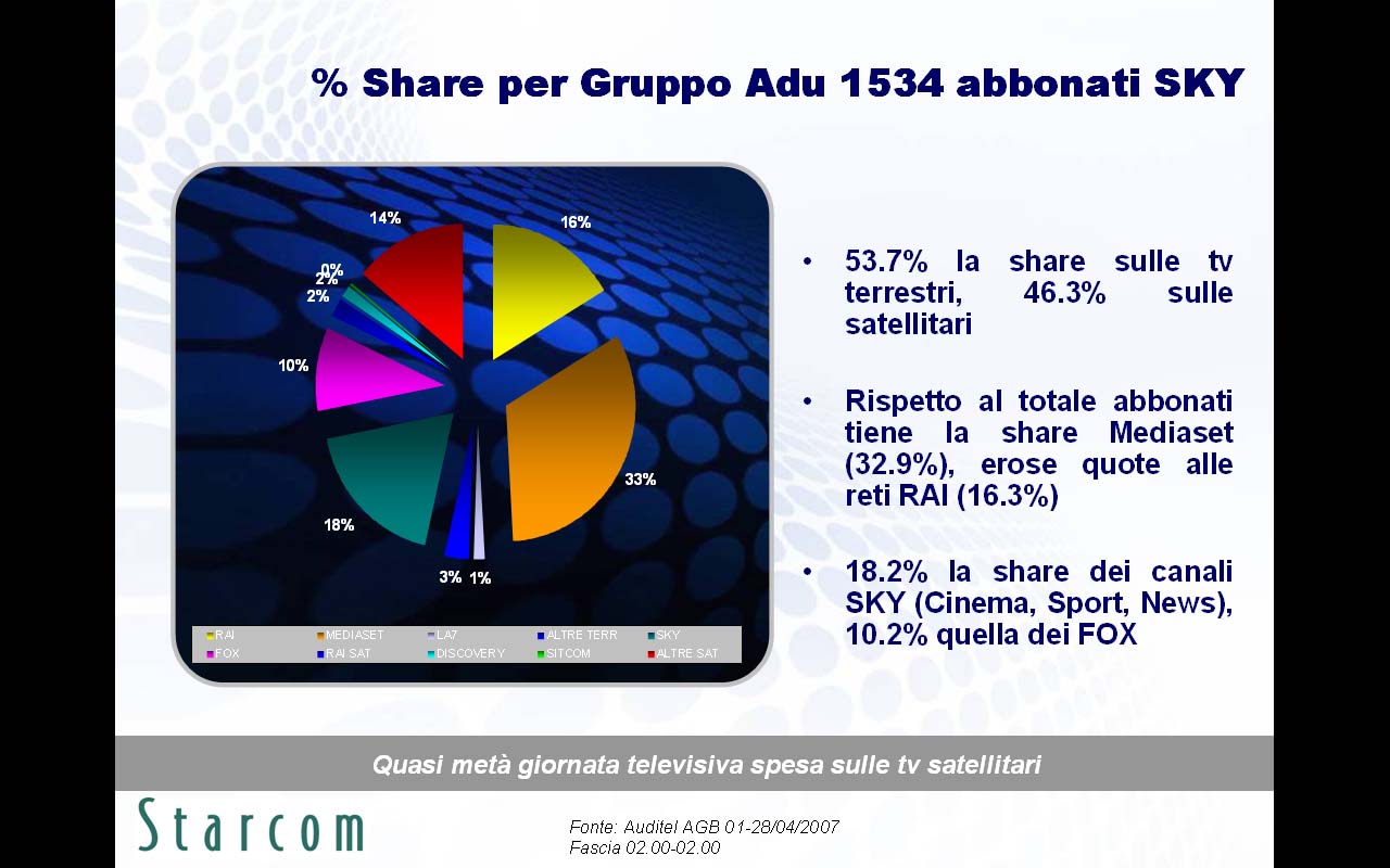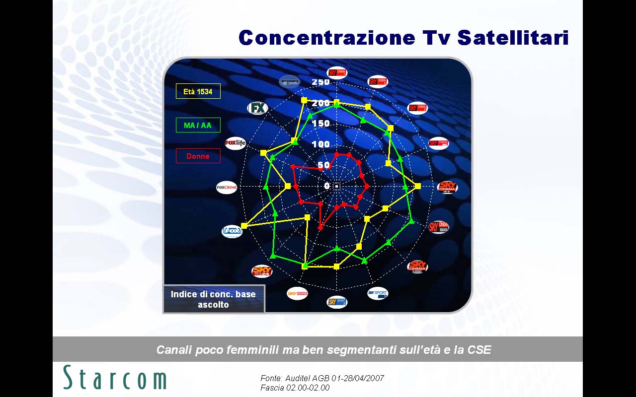 Le principali evidenze emerse nella ricerca (disponibile in allegato) riguardano innanzitutto le brillanti performance in contatti e permanenza di Fox Crime, spinto da due telefilm di successo quali Csi e Grey's Anatomy, l'alta capacità segmentante per i canali Sky su sesso, età e ceto sociale, e i numerosi abbonati a Sky che spendono il 46% della loro giornata televisiva sulle emittenti satellitari.