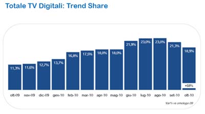 Prosegue la corsa delle tv digitali (sat+digitale terrestre) anno su anno e nell’ultimo mese di ottobre guadagnano il +68% rispetto allo stesso periodo del 2009. Boing, Rai 4, La 5 e Iris occupano le prime quattro posizioni della classifica 'Totale Tv digitali' relativa ai canali più visti. Sul satellite i programmi più apprezzati sono quelli dedicati al calcio.