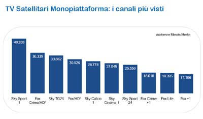 Conferme per quanto riguarda le preferenze dei telespettatori satellitari. I programmi più apprezzati sono, come sempre, quelli dedicati al calcio, con le partite del Campionato di serie A e Champions League, e le notizie in tempo reale/programmi di approfondimento di Sky Sport 24. La partita più vista del mese è il posticipo di domenica 3 ottobre Inter-Juventus, seguita da quasi 1,5 milioni di spettatori su Sky Sport 1 tra le 21 e le 22; lo stesso evento è andato in onda anche sull’altro canale satellitare Calcio 1 (843 mila spettatori in fascia 21-22), posizionato al quinto posto della 'top ten Tv Sat monopiattaforma'.