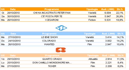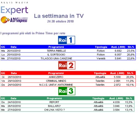Report (Raitre), se pur in ribasso rispetto alla prima puntata, mantiene oltre 4 milioni di telespettatori con il 15,5% di share. Ballarò e Chi l’ha visto si attestano su circa il 13% di share.
