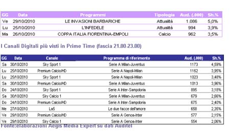 Nel panorama digitale in Prime Time molti canali superano 1 milione di telespettatori grazie ai match di Serie A: su Sky Sport 1 Milan-Juventus arriva a 1 milione 173 mila con il 4,59% di share, mentre su Premium Calcio HD è Napoli-Milan a raggiungere il record con 1 milione 162 mila individui (3,95%). Ottimo risultato per la fiction Le due facce dell’amore che tolta dal palinsesto di Canale 5 e mandata in onda su La 5 cattura 658 mila telespettatori con il 2,35% di share.