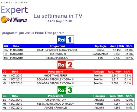Nella settimana dall'11 al 18 luglio l’evento più seguito è la finale Olanda-Spagna su Raiuno, vista da 13,5 mio di individui. Buoni risultati per Super Quark che raggiunge un ascolto di 3,5 mio di individui con il 21,3% di share. Su Canale 5 risultati non pienamente soddisfacenti per il film Perché lo dice mamma (16,6%), seguito dai telefilm I Cesaroni (2,4 mio) e Women’s murder club (1,3 mio).