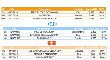 Anche sui canali digitali la partita della finale dei mondiali Olanda-Spagna è il programma più seguito. Il film più visto sui canali digitali è Ricatto d’amore su Sky Cinema 1 con un ascolto di 369 mila spettatori. Ottimi risultati per la programmazione di Rai 4, che con i suoi film conquista tre posizioni nella top ten settimanale: sulla rete diretta da Carlo Freccero il film più seguito è Direct Action con un ascolto di 306 mila individui.