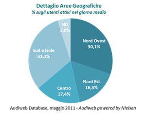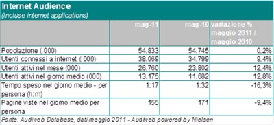 Nel mese di maggio 2011 sono cresciuti del 12,4% su base annua gli utenti attivi che si sono collegati a internet almeno una volta tramite computer. L’audience online nel giorno medio registra un incremento del 12,8% rispetto all’anno precedente, con 13,2 milioni di utenti attivi che hanno trascorso in media 1 ora e 17 minuti al giorno, consultando 155 pagine per persona.