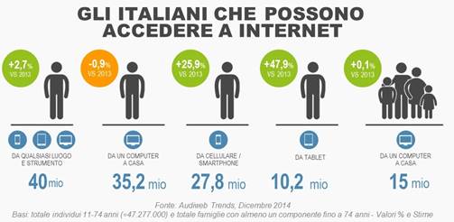 In base al nuovo report sulla diffusione dell’online in Italia, Audiweb Trends, sui dati di sintesi della Ricerca di Base realizzata in collaborazione con DOXA, nel 2014 l’online raggiunge l’84,6% della popolazione italiana tra gli 11 e i 74 anni, 40 milioni di individui che dichiarano di accedere a internet da qualsiasi luogo e strumento. Risultano, inoltre, 27,8 milioni gli italiani che possono accedere a internet da smartphone e 10,2 milioni da tablet.