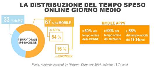 Nel 2014 si rileva il primato del mobile nella fruizione quotidiana di internet, con una media di 15,6 milioni di utenti online da device mobili (smartphone e tablet) e 12,7 milioni di utenti online da PC.