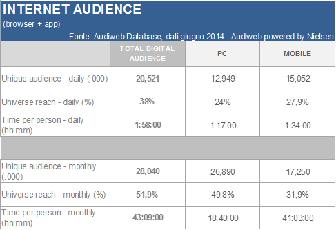 Sintesi dei dati dell’audience totale di internet - Audiweb Database giugno 2014