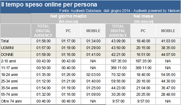 L’audience totale nel giorno medio è rappresentata da 20,5 milioni di utenti online. La fruizione di internet da mobile (smartphone e tablet) ha generato il 58,5% del tempo totale speso online con 1 ora e 34 minuti di tempo speso per persona.