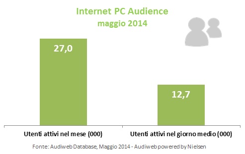 Nel mese di maggio 2014 sono 27 milioni gli italiani dai 2 anni in su che si sono collegati almento una volta a internet da PC, 12,7 milioni nel giorno medio.