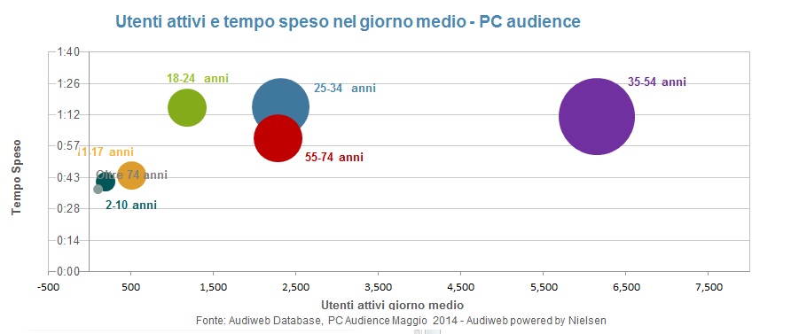 Gli utenti di età compresa tra i 35 e i 54 anni rappresentano il 48% degli utenti online da PC nel giorno medio (6 milioni), collegati in media per circa 1 ora e 11 minuti.