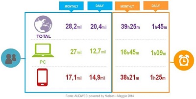 Nel giorno medio risultano 14,9 milioni di utenti online da device mobili, collegati in media per 1 ora e 25 minuti per persona.