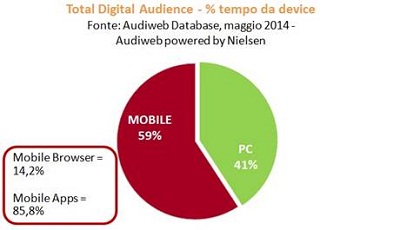 La fruizione di internet da mobile (smartphone e tablet) a maggio ha generato il 59% del tempo totale speso online, con il 51% derivante dalla fruizione tramite applicazioni mobile.