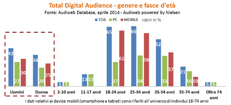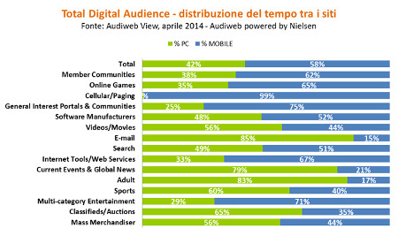 Nel mese di aprile 2014 l’audience totale nel giorno medio raggiunge 20,6 milioni di utenti, mentre l'audience mobile è costituita da 14,8 milioni nel giorno medio. Il 51,7% del tempo totale speso online è generato tramite mobile applications. Per la fruizione di internet da mobile, l’88,5% del tempo speso tramite device è generato dall’uso di mobile app. Più tempo viene generato da PC nella consultazione delle email, nella fruizione delle news online, su siti di eCommerce e su siti specifici di intrattenimento.