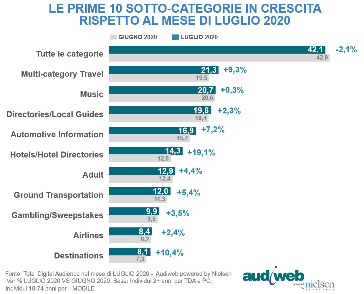 Audiweb. Total Digital Audience: nel mese di luglio online 42,1 milioni di utenti. Continua la flessione stagionale (-2,1%). Interesse per viaggi e spostamenti