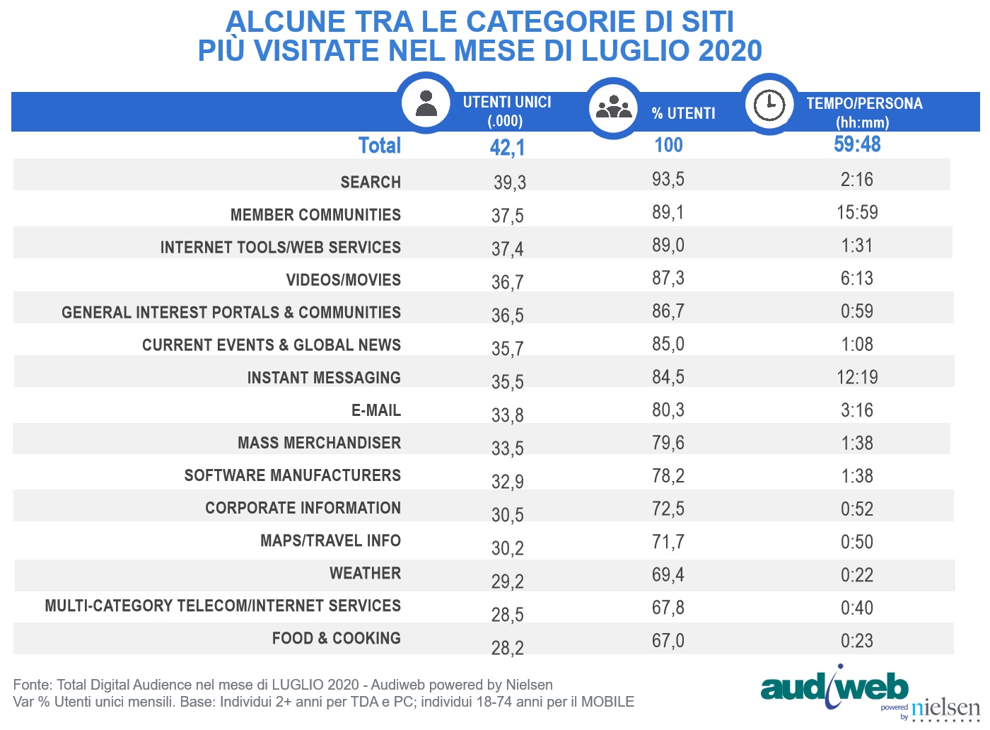 Più in dettaglio, tra le sotto-categorie di siti più visitate nel mese di luglio resta confermato il quadro dei mesi precedenti, sebbene con valori in leggero calo rispetto a giugno. Tra le principali: la sotto-categoria Search raggiunge il 93,5% degli utenti online, con 39,3 milioni di utenti (-3,2% rispetto a giugno); i Social Network - Member Communities - raggiungono l’89,1% degli utenti online, con 37,5 milioni (-2,2%); i siti di strumenti e servizi online - Internet tools/Web Services - raggiungono l’89%, con 37,4 milioni di utenti (-3,5%); la sottocategoria Video/Movies raggiunge l’87,3% degli utenti, 36,7 milioni di utenti (-2,9%); i portali generalisti - General Interest Portals & Communities - sono stati visitati dall’86,7% degli utenti online, 36,5 milioni (-4%); i siti di news online raggiungono l’85% degli utenti, 35,7 milioni (-2,5%); i servizi di messaggistica istantanea raggiungono l’84,5% degli utenti, 35,5 milioni (-1,8%); la sotto-categoria E-mail raggiunge l’80,3%, 33,8 milioni di utenti (-5%); l’ecommerce - Mass Merchandiser - raggiunge il 79,6%, con 33,5 milioni di utenti (-3,7%); i siti e le piattaforme di software - Software Manufacturers - il 78,2%, con 32,9 milioni (-5,7%).