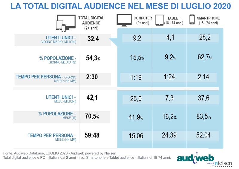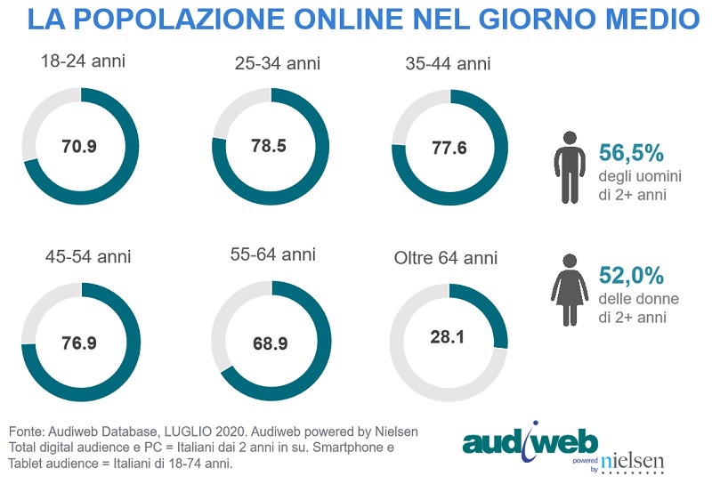 Per quanto riguarda i dati sul profilo degli individui online, nel giorno medio a luglio si sono collegati almeno una volta dai device rilevati il 52% delle donne (15,6 milioni) e il 56,5% degli uomini (16,8 milioni). Più in dettaglio erano online il 70,9% dei 18-24enni (3,1 milioni), il 78,5% dei 25-34enni (5,2 milioni), il 77,6% dei 35-44enni (6,6 milioni), il 76,9% dei 45-54enni (7,5 milioni), il 68.9% dei 55-64enni (5,9 milioni) e il 28.1% degli over 64enni (3,8 milioni).