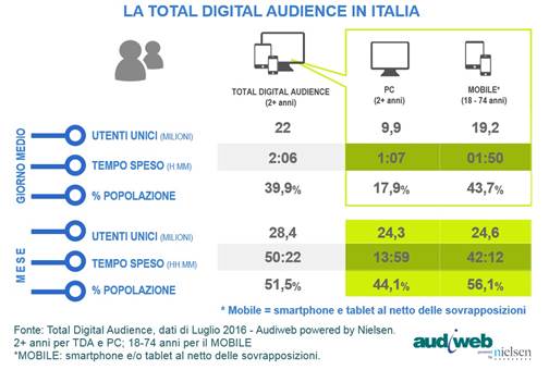 La total digital audience nel giorno medio ha raggiunto 22 milioni di italiani dai 2 anni in su, online dai device rilevati (PC, smartphone e/o tablet) per 2 ore e 6 minuti in media.