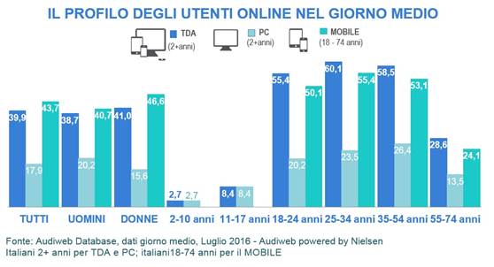 Per quanto riguardo il profilo degli italiani online dai device rilevati, a luglio erano online nel giorno medio il 38,7% degli uomini (10,6 milioni) e il 41% delle donne (11,4 milioni).