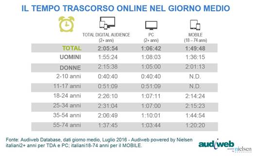 Il tempo speso online nel giorno medio supera le due ore. In particolare, i 18-24enni e i 25-34enni hanno dedicato alla navigazione da tutti i device rilevati (PC, smartphone e/o tablet), rispettivamente, 2 ore e 26 minuti i primi e 2 ore e 31 minuti la seconda fascia, prediligendo la fruizione da mobile che registra circa 2 ore e 15 minuti.