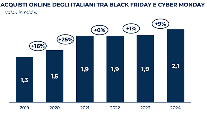 Secondo le stime dell’Osservatorio eCommerce B2cNetcomm - School of Management del Politecnico di Milano, nei giorni compresi tra il Black Friday e il Cyber Monday, gli italiani spenderanno online oltre 2 miliardi di euro (+9% rispetto al 2023). In questa occasione, gli operatori particolarmente competitivi realizzeranno anche 10 volte il fatturato di un giorno medio, il doppio rispetto al 2023.