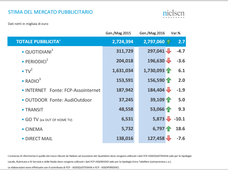 Il mercato degli investimenti pubblicitari in Italia nel mese di maggio è stabile a +0,4%: i primi 5 mesi si attestano a +2,7%, rispetto allo stesso periodo del 2015, grazie a un incremento nella raccolta di circa 73 milioni di euro.