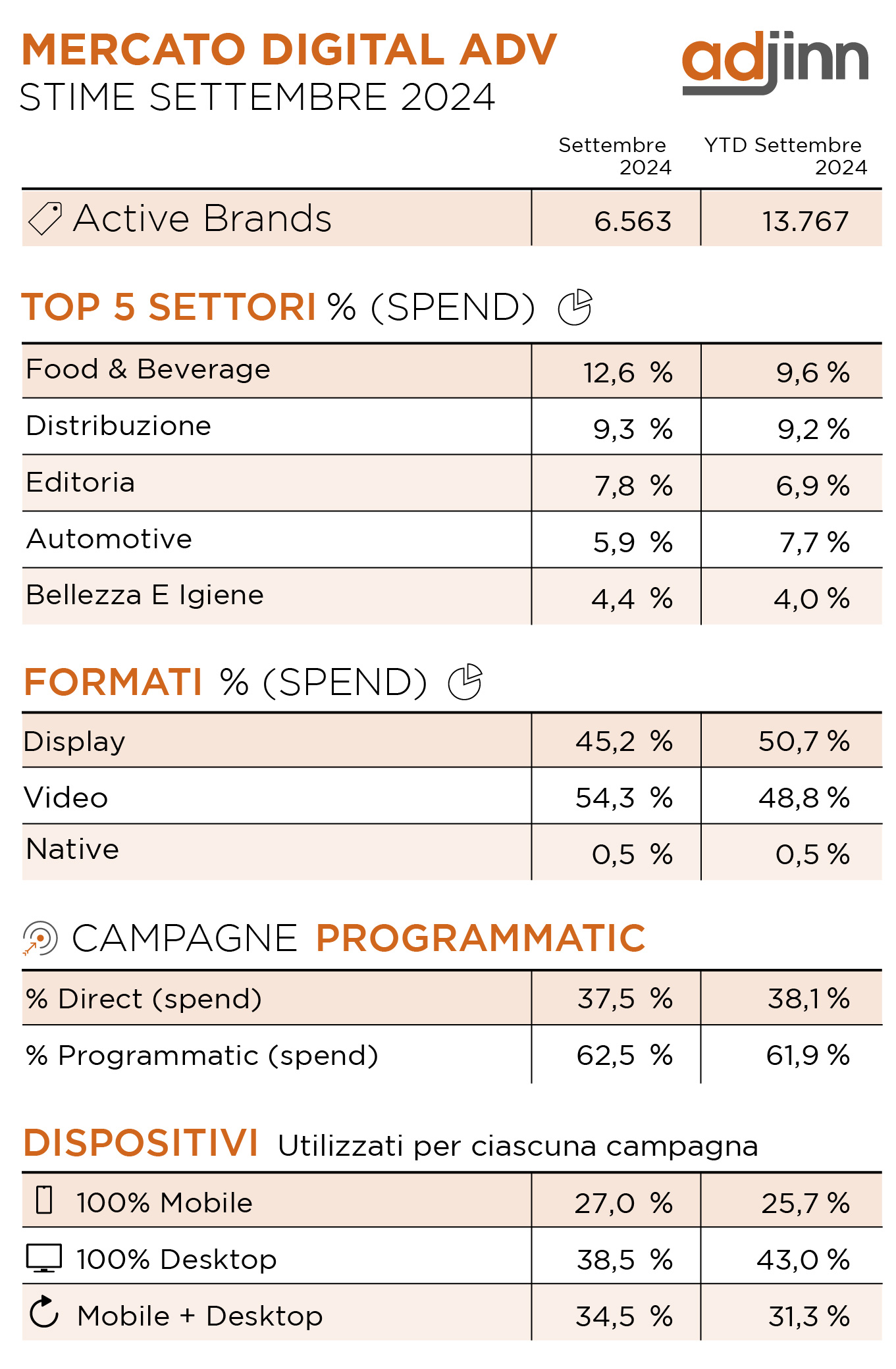 Le campagne in Direct si confermano su livelli costanti, con un’incidenza del 37,5%, segno di una continuità nelle strategie tradizionali, mentre il Programmatic continua a detenere la maggioranza della spesa con il 62,5%.