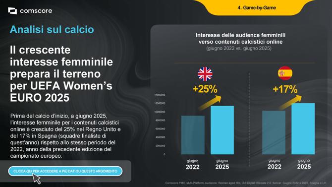 Calcio: i migliori club calcistici sono brand globali con influenza mondiale, con un engagement costante, soprattutto durante eventi internazionali. Crescente interesse femminile verso contenuti calcistici online tra giugno 2022 e giugno 2025, preparazione per UEFA Women’s Euro 2025.