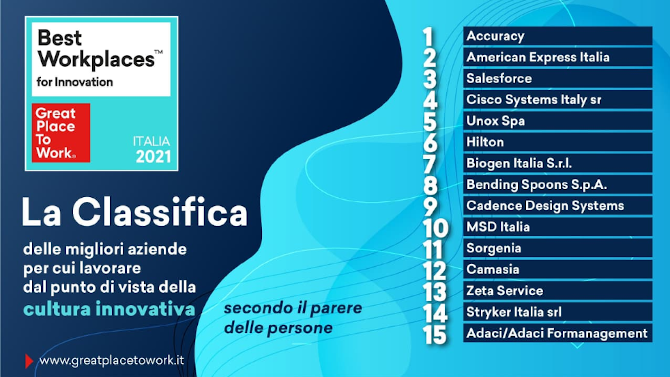 Great Place to Work Italia realizza la Classifica "Best Workplaces for Innovation 2021" delle 15 aziende con la cultura più innovativa in Italia secondo i dipendenti