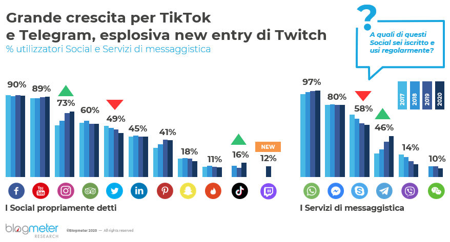 Quest’anno la survey rileva per la prima volta anche Twitch – piattaforma di live streaming di proprietà di Amazon, su cui è possibile trovare contenuti inerenti al mondo dei videogiochi, eventi sportivi in diretta, e-sports o in generale episodi di vita quotidiana – che è già utilizzata dal 12% degli italiani. In crescita anche TikTok (+3% rispetto all’anno scorso) che viene considerato da alcuni target d’età sempre più un “social di cittadinanza” (ovvero un social che viene utilizzato più volte a settimana dall’utente e che contribuisce a definire la sua identità relazionale).