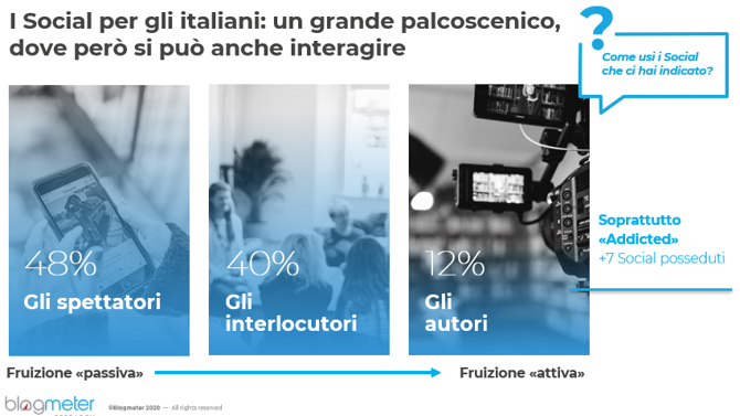La ricerca dimostra come i social siano innanzitutto un grande palcoscenico per gli italiani: il 48% li usa prevalentemente per guardare foto e video, per non perdersi quello che succede nel mondo e nella cerchia dei propri amici. I social rimangono anche un luogo di interazione e così il 12% degli utenti del nostro Paese li utilizza come un canale di visibilità, postando i propri contenuti.
