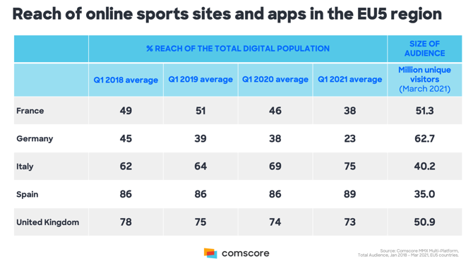 Le ultime settimane hanno visto un nuovo proliferare di gare, sfide e concorsi a tema sportivo, tra colleghi d’ufficio e ambienti domestici, in tutta la regione EU5. Nonostante l'entusiasmo per l'inizio del campionato europeo di calcio, il mondo dello sport continua a vivere tempi difficili: senza considerare la pandemia globale che ha interrotto molte attività sportive e ricreative in tutto il mondo, la portata dei siti e delle app di digital sport all'interno della regione EU5 è generalmente rimasta statica fin dal primo trimestre del 2020, quindi anche prima che il Covid prendesse il sopravvento sulla vita quotidiana di tutti (vedi tabella sotto).