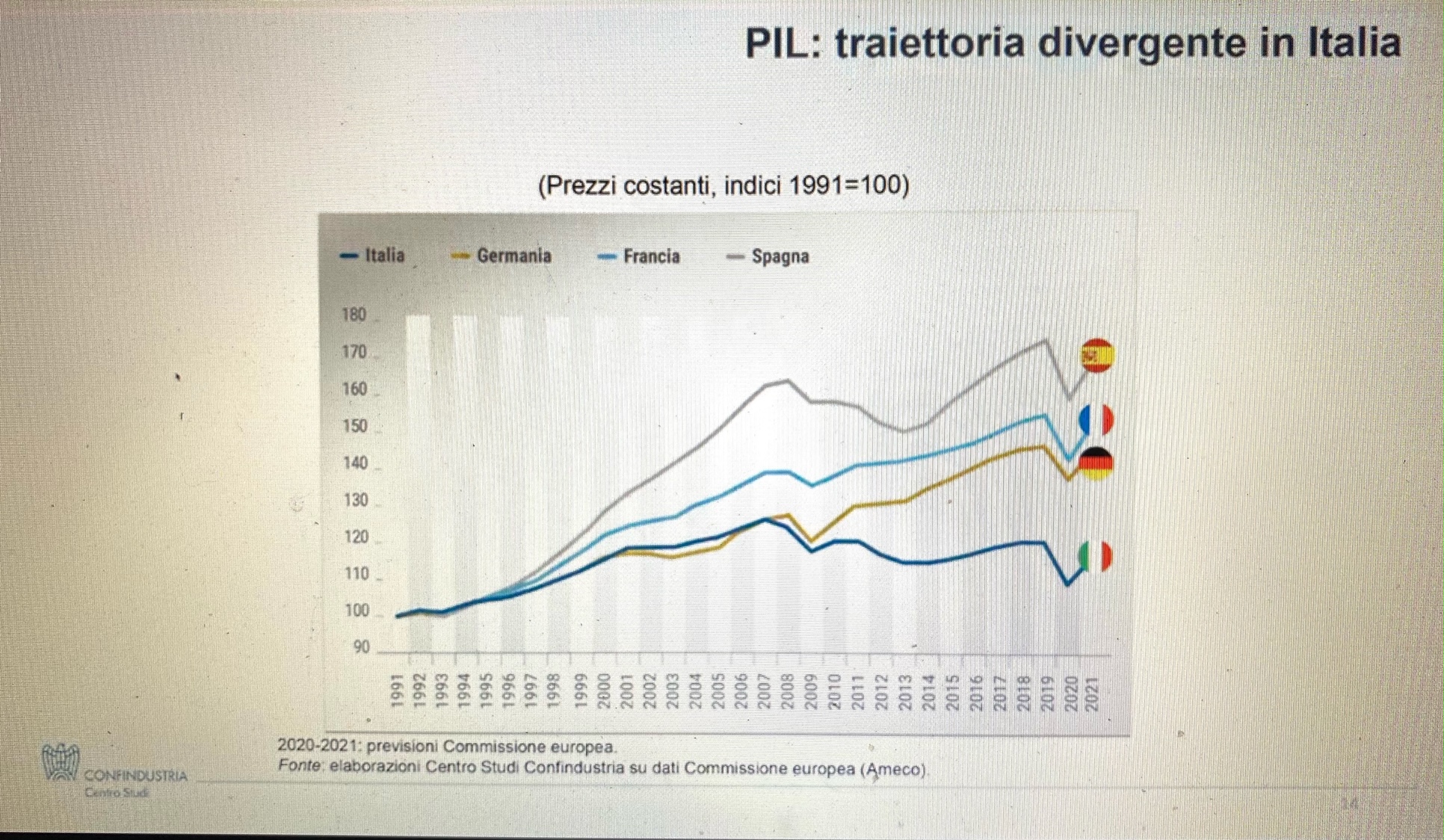 estera in questi anni è stata molto rilevante per la ripresa dell’economia italiana, ma in questo momento sembra compressa. Il PIL si allontana sempre più da quelli di altri Paesi europei – spiega Manzocchi -. E ciò ha molto a che fare con la dinamica della produttività e degli investimenti pubblici, che sono fondamentali per la ripresa (vedi sanità, istruzione ecc, ndr).