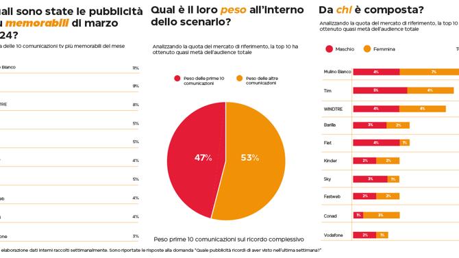 Nella classifica delle top ten del mese di marzo, si è distinta in prima posizione la comunicazione Mulino Bianco, seguita da TIM e da WINDTRE. Analizzando la share of voice si evidenzia un vero e proprio fenomeno di concentrazione del ricordo dove le prime dieci comunicazioni citate rappresentano quasi la metà del ricordo spontaneo di tutte le comunicazioni ricordate (47%).