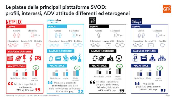 Platee ricettive e diversificate, non solo in termini demografici: per esempio il pubblico per lo più maschile di DAZN ha un’età media di 47 anni mentre quelli di Netflix e Disney+ non superano i 40 anni. Amazon Prime Video spicca invece per una dotazione di risorse socioeconomiche piuttosto alta, ma emergono anche e soprattutto differenze di mindset, interessi e consumi. Infatti, se fra le principali passioni della platea Amazon Prime Video spiccano tecnologia, cinema e scienza, il pubblico di Netflix ha interessi molto variegati (videogiochi, moda, cinema, musica, viaggi...).