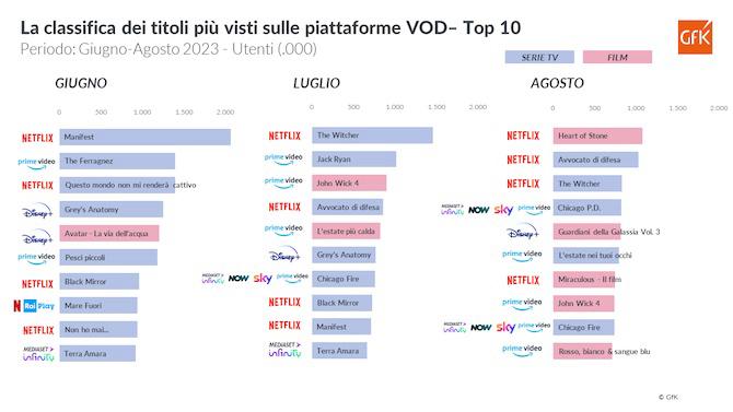 La classifica dei titoli più fruiti sulle piattaforme VOD. Nel periodo compreso tra giugno e agosto 2023 gli utenti delle piattaforme Video on Demand sono stati in media 27,4 milioni, con un picco di 29,9 milioni nel mese di giugno, che poi sono diminuiti leggermente nei mesi successivi (come è normale nel periodo estivo). Su base mensile, le visualizzazioni sono state circa 283 milioni con un tempo medio dedicato di 258 milioni di ore (circa 9 ore al mese per utente).