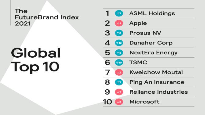 4. La tecnologia la fa da padrona: il settore della tecnologia domina il FutureBrand Index con ben 3 aziende tra i primi 5 brand: ASML, Apple e Prosus NV.