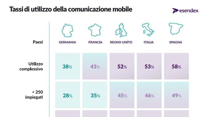 Secondo una ricerca condotta da Esendex, in collaborazione con PwC, l'Italia, con il 53% di aziende che si avvalgono di strumenti di mobile messaging, tra cui si annoverano SMS e applicazioni OTT, come WhatsApp e Facebook Messenger, si attesta al secondo posto dopo la Spagna, dove le imprese che affermano di utilizzare la comunicazione mobile sono ben il 58%. Al terzo posto troviamo poi il Regno Unito con il 52%, seguito a distanza da Francia (43%) e Germania (38%).