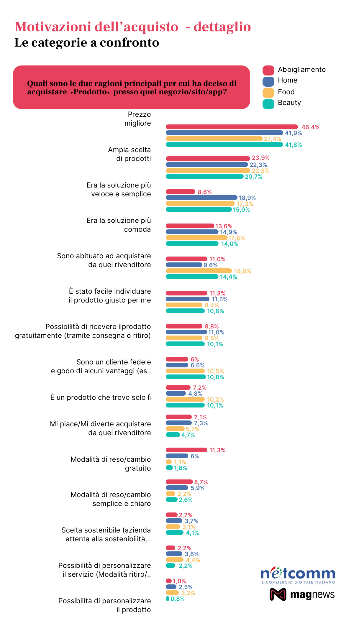 Il prezzo e la selezione sono decisivi nelle quattro categorie di prodotto, ma non sono gli unici criteri: la possibilità dei resi è rilevante per l’abbigliamento; la semplicità e la comodità sono importanti per l’acquisto di arredi e per il beauty; nel food conta ancora il rapporto di fiducia con il rivenditore.
