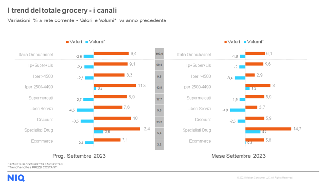 All’interno del comparto Grocery in merito al rapporto tra valori e volumi a totale Italia Omnichannel, nel mese di settembre 2023 si evidenzia un andamento positivo a valore (+6,1% vs 2022), mentre si conferma - come nei mesi precedenti - una contrazione a livello di volumi, pari a -1,8%.