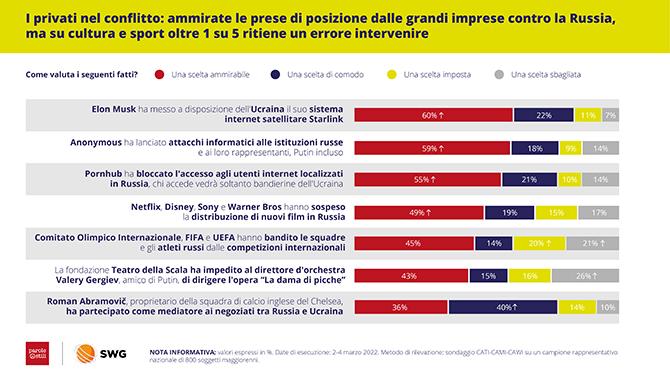 Vasto consenso, per Elon Musk (+60%) e per Anonymous (+59%) le cui scelte di mettere a disposizione il sistema internet Starlink e lanciare attacchi informatici alle istituzioni russe sono state considerate ammirevoli. Sul podio anche Pornhub (+55%) per aver bloccato l’accesso agli utenti geo-localizzati in Russia e reazioni positive (+49%) dagli intervistati anche per le aziende di fruizione contenuti come Netflix, Disney, Sony e Warner Bros che hanno sospeso la distribuzione di nuovi film in Russia. Un intervistato su 5 ha espresso dissenso, invece, sia sulle posizioni del Comitato Olimpico Internazionale, della FIFA e della UEFA sull’aver bandito le squadre e gli atleti russi dalle competizioni internazionali sia sulla scelta della Fondazione Teatro della Scala di far dirigere l’opera “La Dama di Picche” al direttore d’orchestra Valery Gergiev, amico di Putin. Da evidenziare il parere su Roman Abramovich la cui partecipazione come mediatore ai negoziati tra Russia e Ucraina è stata considerata una scelta di comodo dal 40% degli intervistati.
