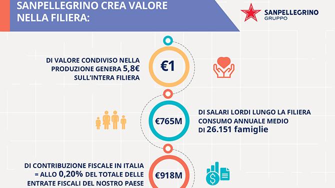I 2,5 miliardi di euro che Sanpellegrino ha contribuito a generare sono composti da 310 milioni di euro di ricadute dirette del gruppo, 1.365 milioni di euro di ricadute indirette dalle attività della filiera e 817 milioni di euro di ricadute indotte. Inoltre, il 96% delle ricadute del valore condiviso creato non è trattenuto dall’azienda ma distribuito a Stato, altre aziende dell’indotto e lavoratori.