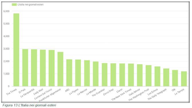 I risultati, ottenuti sfruttando un palinsesto composto da oltre 400mila fonti e analizzando più di 50mila articoli provenienti da testate straniere, evidenziano appunto come sia la Germania la nazione più interessata agli affari italiani, con 14.425 articoli pubblicati sui quotidiani più importanti. Al secondo posto la Francia con 13.082 articoli, seguita dall'Inghilterra con 11.799 e dalla Spagna con 9.937. Gli Stati Uniti, invece, hanno prodotto solo 4.641 articoli sulle vicende italiane, dimostrando un minore interesse rispetto agli altri Paesi europei.
