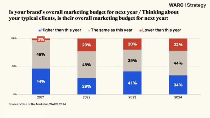 C'è ottimismo e una previsione nella crescita del business per il 2025 in due professionisti del marketing su tre (65%), così come per l'incremento dei budget marketing (il 34% prevede he cresceranno l'anno prossimo).