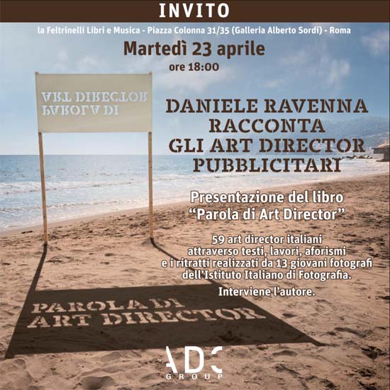 Dopo il successo di pubblico presente al debutto presso La Feltrinelli di Piazza Piemonte a Milano il 22 marzo (Guarda il video e leggi news correlata) e il 19 aprile a Torino, 'Parola di Art Director', volume dedicato ai principali art director della scena italiana edito da ADC Group, continua nel tour di presentazione con la tappa romana che lo vedrà protagonista il 23 aprile alle ore 18.00 a Roma presso la Feltrinelli di Galleria Colonna. (In allegato l'invito)