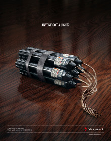 Il concept “creatività esplosiva”, continuum ed evoluzione della campagna precedente, è stato sviluppato attraverso un’immagine d’impatto: numerosi candelotti di perossido d’idrogeno con le micce intrecciate sormontati dallo slogan “Anyone got a light?”. L’agenzia si presenta quindi come materiale esplosivo, a cui basta una scintilla - un’idea - per deflagrare con tutta la sua potenzacreativa.