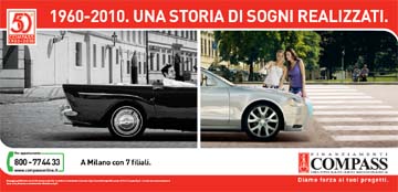 Il piano di comunicazione ideato per il 50esimo anniversario da Lorenzo Marini& Associati/Nerimarini (vincitore di una gara) fa emergere i tratti distintivi di Compass: il dna di Mediobanca, la solidità di una struttura presente da 50 anni sul mercato, la vicinanza alle famiglie e ai loro progetti e la capacità di sapersi evolvere insieme a loro, unita ad un forte tratto di italianità di cui la società è orgogliosa.