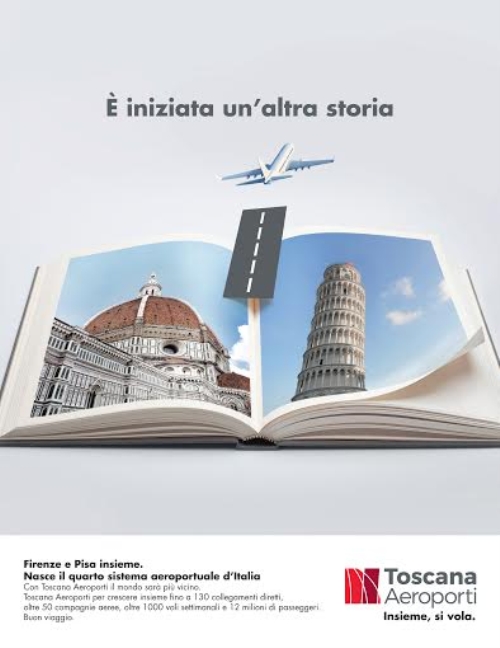 Nasce Toscana Aeroporti, il quarto sistema aeroportuale d'Italia, e l'agenzia, selezionata come partner da Aeroporto di Firenze, firma la campagna istituzionale di lancio. Il visual mette fianco a fianco due monumenti simbolo delle città di Firenze e Pisa su di un libro