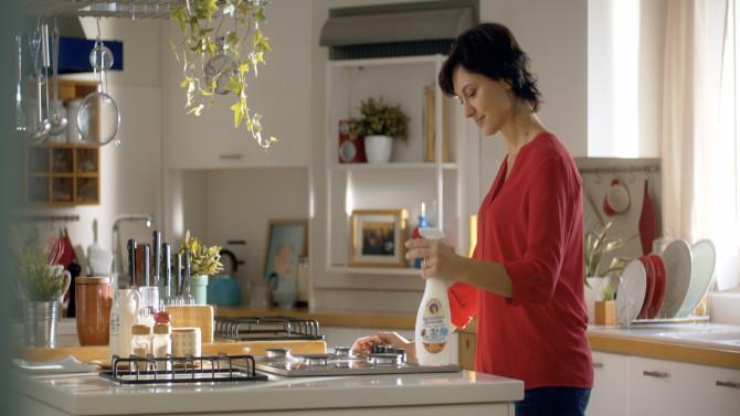 Nello spot si susseguono una serie di scene in cui lo Sgrassatore viene conteso tra mamma, papà, figlio e figlia perché… lo vogliono tutti! Ognuno di loro lo utilizza, infatti, per pulire al meglio una superficie diversa, valorizzando così l’estrema versatilità del prodotto.