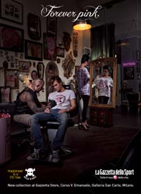 La campagna stampa a firma Publicis fotografa un momento in un particolare studio di tatuatori al cui interno un ragazzo, in primo piano, si sta facendo “tatuare” la maglietta mentre, in secondo piano una splendida ragazza, molto rock, ammira allo specchio il tattoo/maglietta che ha appena fatto.